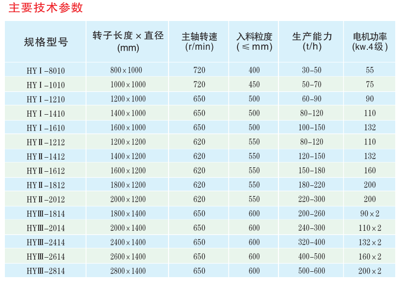 規(guī)格型號 | 轉(zhuǎn)子長度*直徑(mm) | 主軸轉(zhuǎn)速(r/min) | 入料粒度(≤mm) | 生產(chǎn)能力(t/h) | 電機功率(kw.4級) |